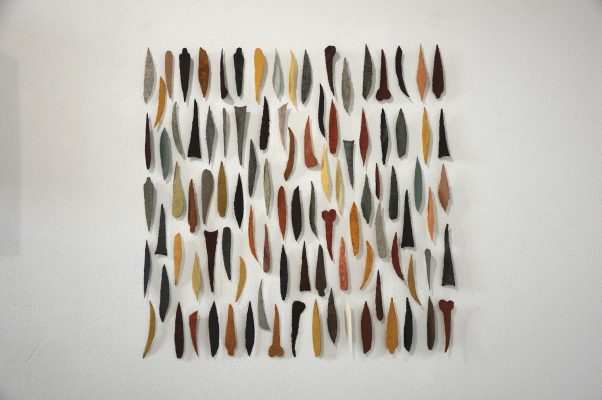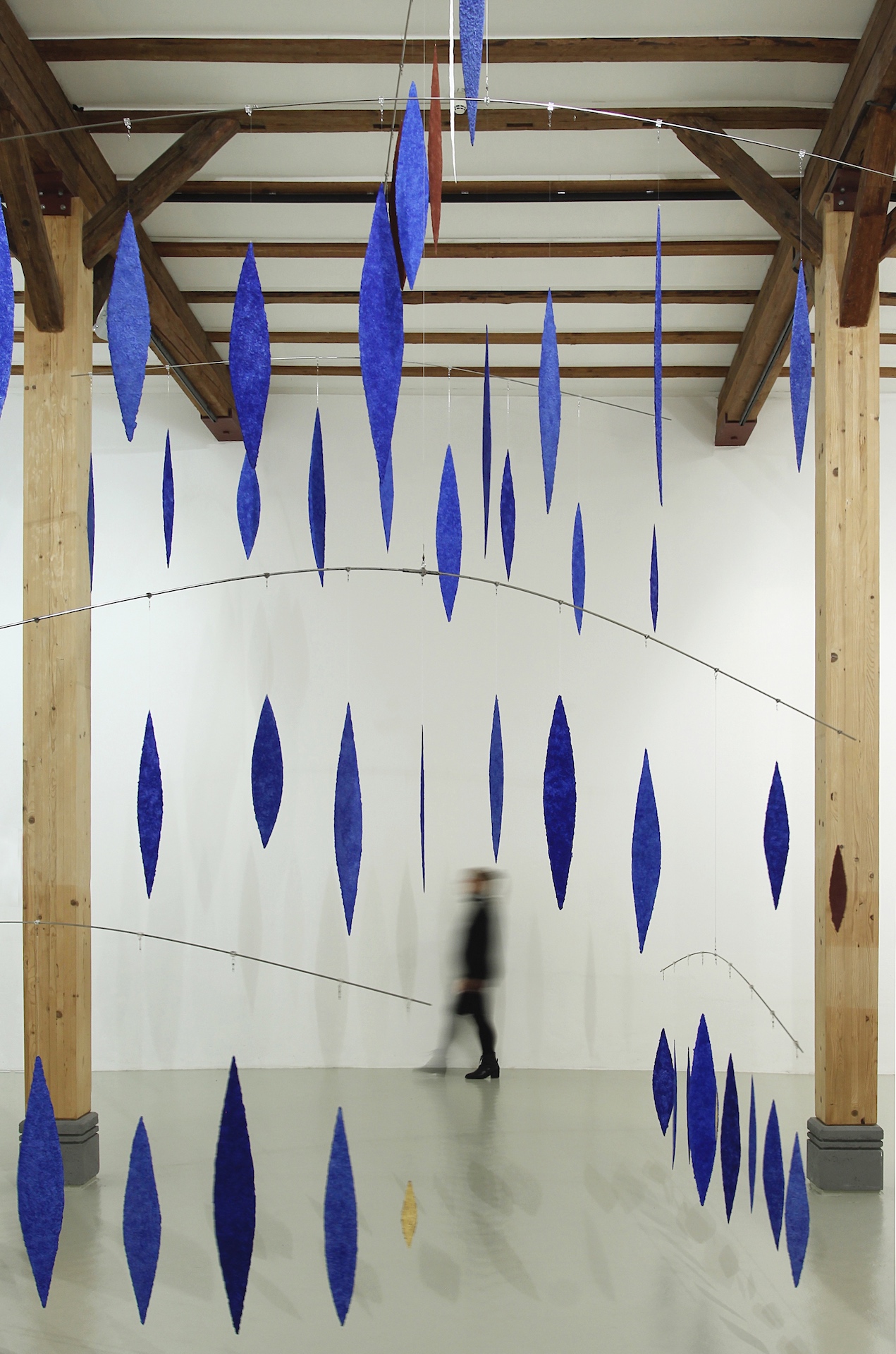 Der imaginäre Raum, den die Installation Lichtsteine im architektonischen Raum der vier tragenden Holzpfeiler beschreibt, korrespondiert mit den Wandarbeiten, die aus miteinander reagierenden Elementen bestehen. Eine besondere Beziehung der luftbewegten Rauminstallation stellt sich zur 97-teiligen Arbeit Terre aus dem Jahr 2011 ein: ihre Elemente, geschöpft aus Zellulose und Erden aus Mexiko, Spanien und Apulien, haben jedes eine charakteristische, unwiederholbare Form, ergeben jedoch in der Hängung ein vorstellbares Quadrat.