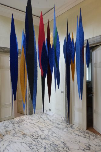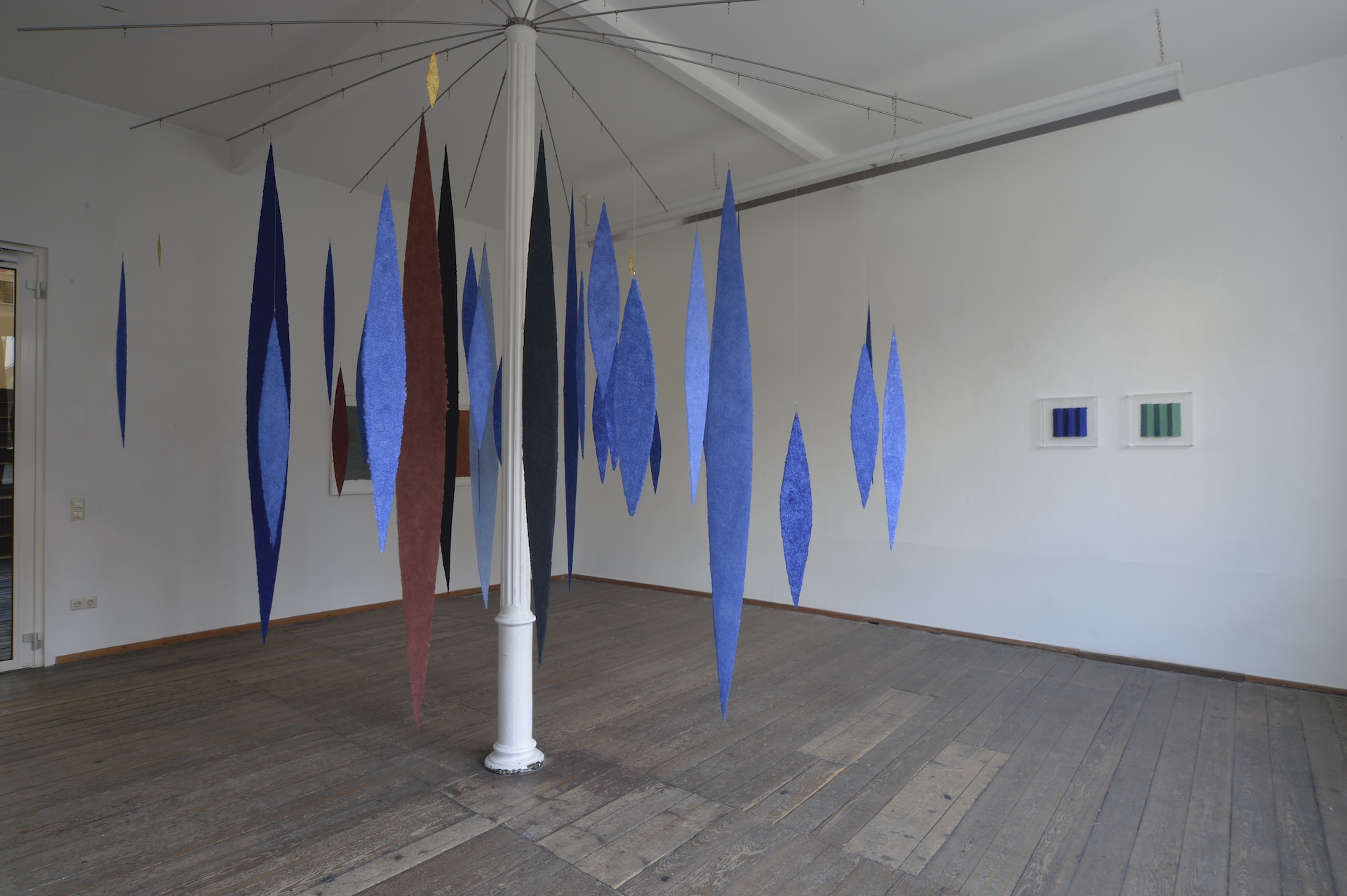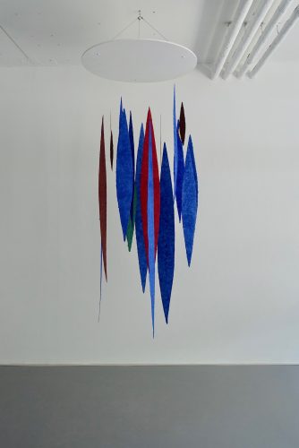 Auch die raumgreifende Installation „Meteore“ (2017/2020) besteht aus mehreren dieser Lanzettformen, die an feinen Fäden an der Decke des Raumes befestigt werden. Wie ein Mobile reagieren die vielfarbigen Elemente auf Bewegungen im Raum. Sie drehen sich sacht, fangen das Licht auf immer wechselnde, unwiederholbare Art und Weise ein. Während sich das eine Element in voller Farbenpracht frontal präsentiert, verschwindet ein anderes, wird verdeckt oder durch eine Drehung von der Fläche zur Linie.